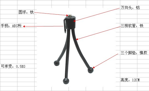 迷你三角架 采用优质金属软管,高度12CM,采用国际标准接口,适合相机和数码摄像相机产品,表面电泳黑色漆
