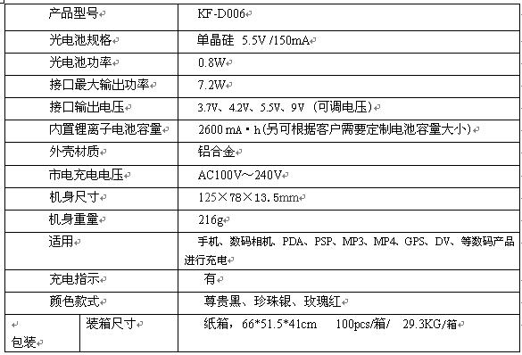 手机或其它数码产品充电60分钟,就可以获得长达100-150分钟的使用时间。 环保、节能,绿色能源太阳能,带有高亮度远视距LED照明灯,照明达30多小时,带有电源管理充电保护功能,使用更加安全。